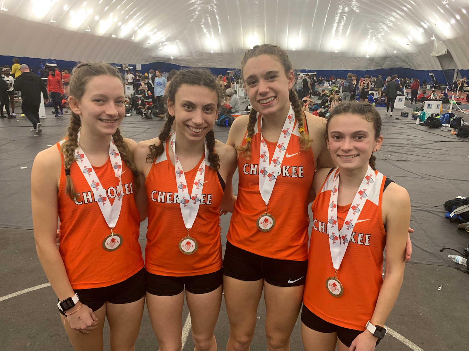 Cherokee’s Kelsey Niglio, Kerry O’Day, Megan Niglio and Nicole Clifford ran the No. 10 3,200-meter relay in state history Tuesday night at the Bubble.