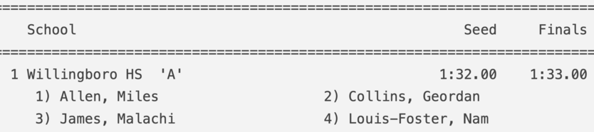 According to the 4-by-2 results, seniors Miles Allen and Geordan Collins, James and senior Nam Louis Foster ran for Willingboro. We don’t know who actually ran along with Allen, Collins and Foster.